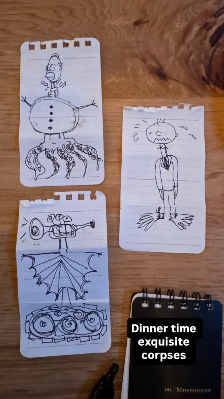 These exquisite corpses we made at dinner gave me the idea to write about my favorite drawing game.